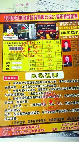 这位76岁的老人很惊讶,自己从未中过这么大的奖。她说:“我平常喜欢看北京电视台的《养生堂》节目,我还以为这公司和《养生堂》节目有关系呢。”另外快递里还有一份“公证书”,称这个刮奖活动经过了北京市丰台区公证处的公证。